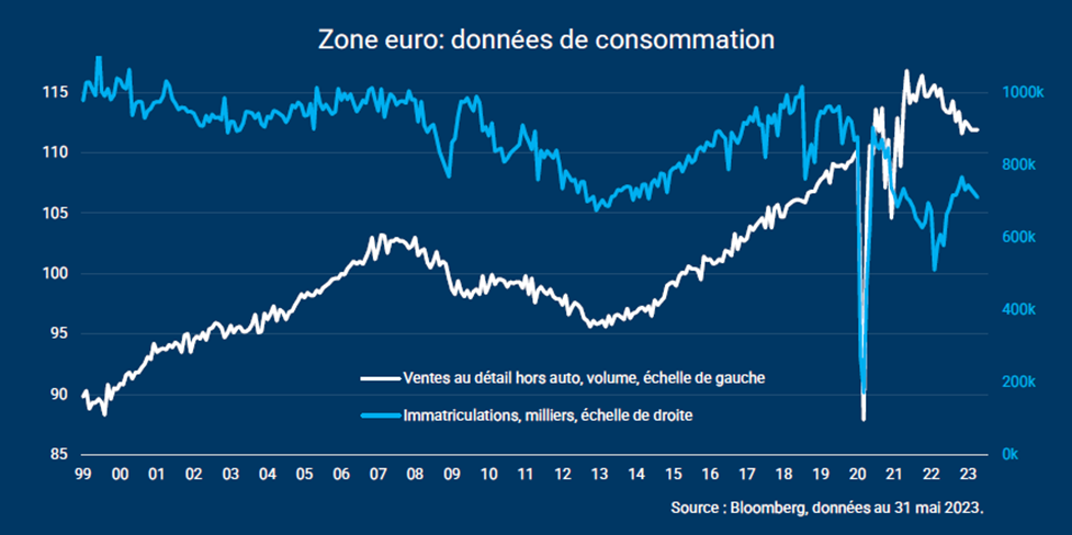 Après avoir fortement chuté depuis le printemps 2022, les ventes au détail (hors automobiles) ont fait du surplace en avril et en mai. Les immatriculations ont quant à elles atteint un point haut en décembre dernier et baissent régulièrement depuis. La consommation des ménages a pesé sur la croissance au quatrième trimestre 2022 et au premier trimestre 2023. À moins d’un rebond très fort en juin, elle va probablement continuer à peser sur l’activité au deuxième trimestre 2023.