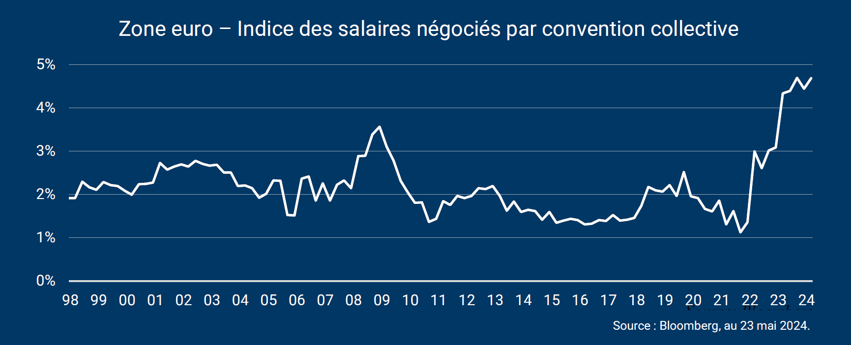 La BCE vient de publier son estimation de l’évolution des salaires négociés par convention collective au premier trimestre en zone euro. Alors qu’un ralentissement était attendu, cette mesure reste sur une progression élevée à +4,7%. Cette donnée va-t-elle empêcher la BCE de baisser ses taux en juin ?